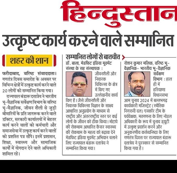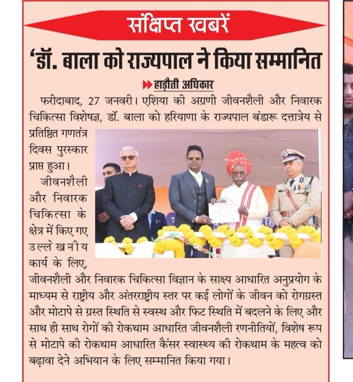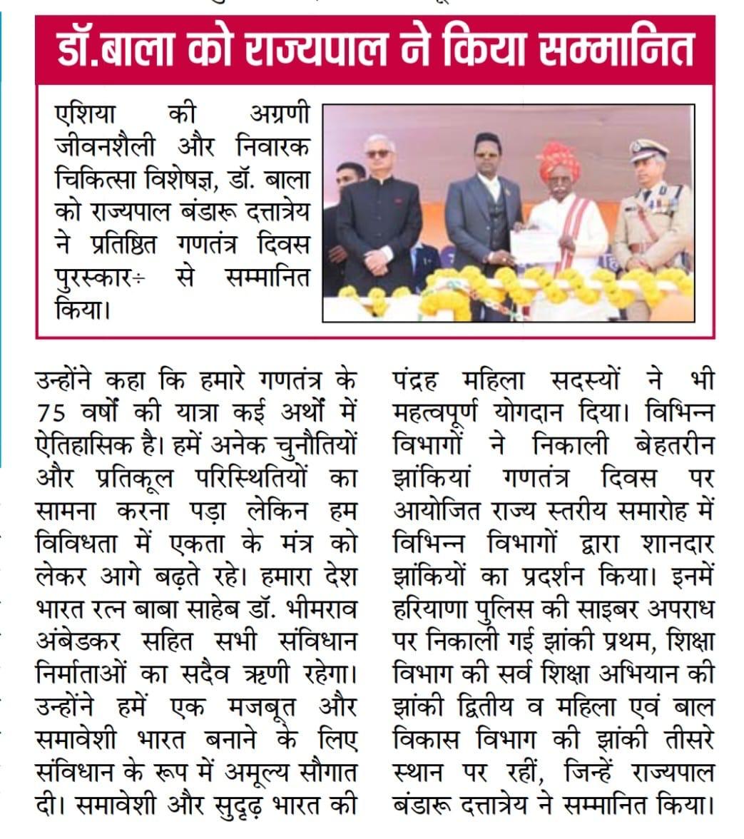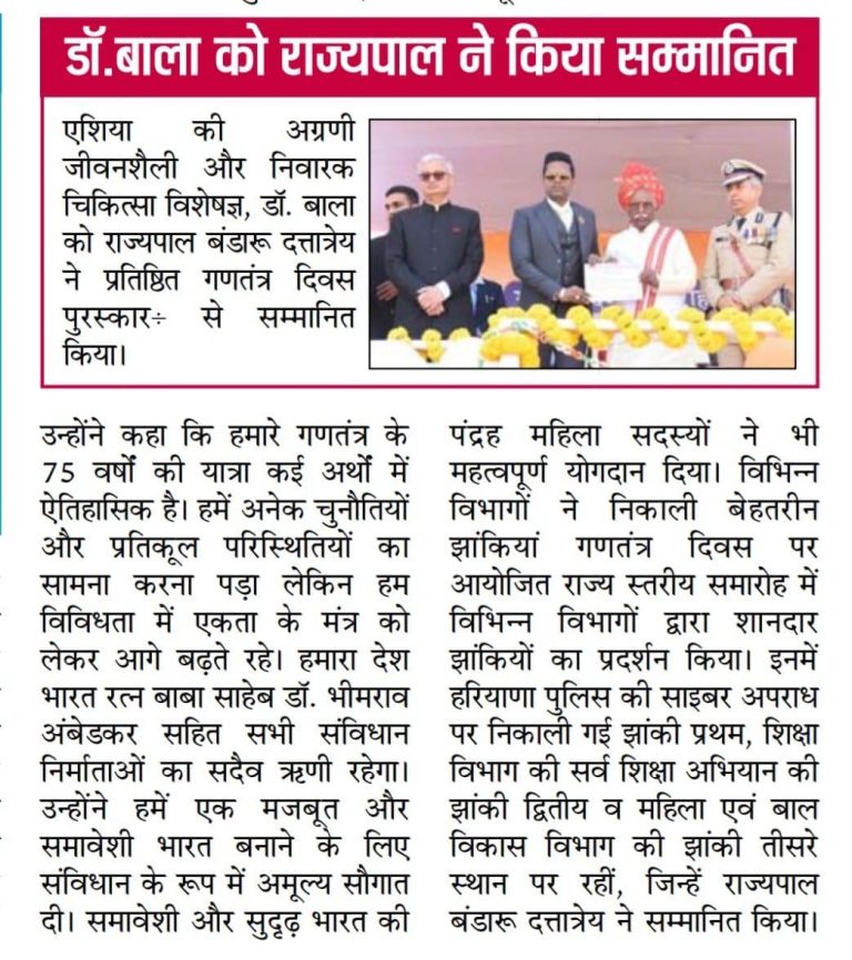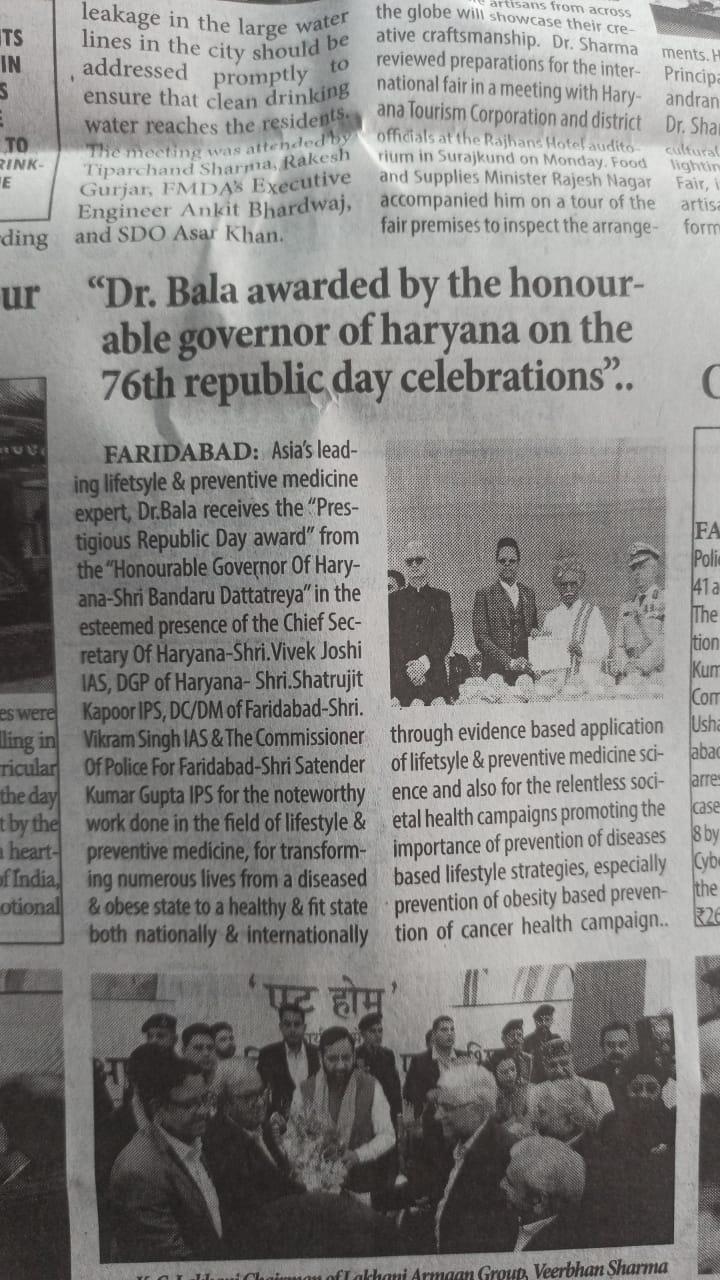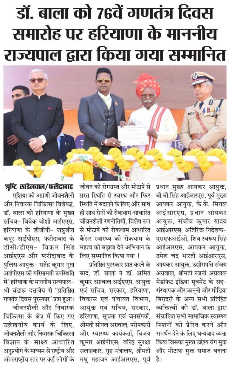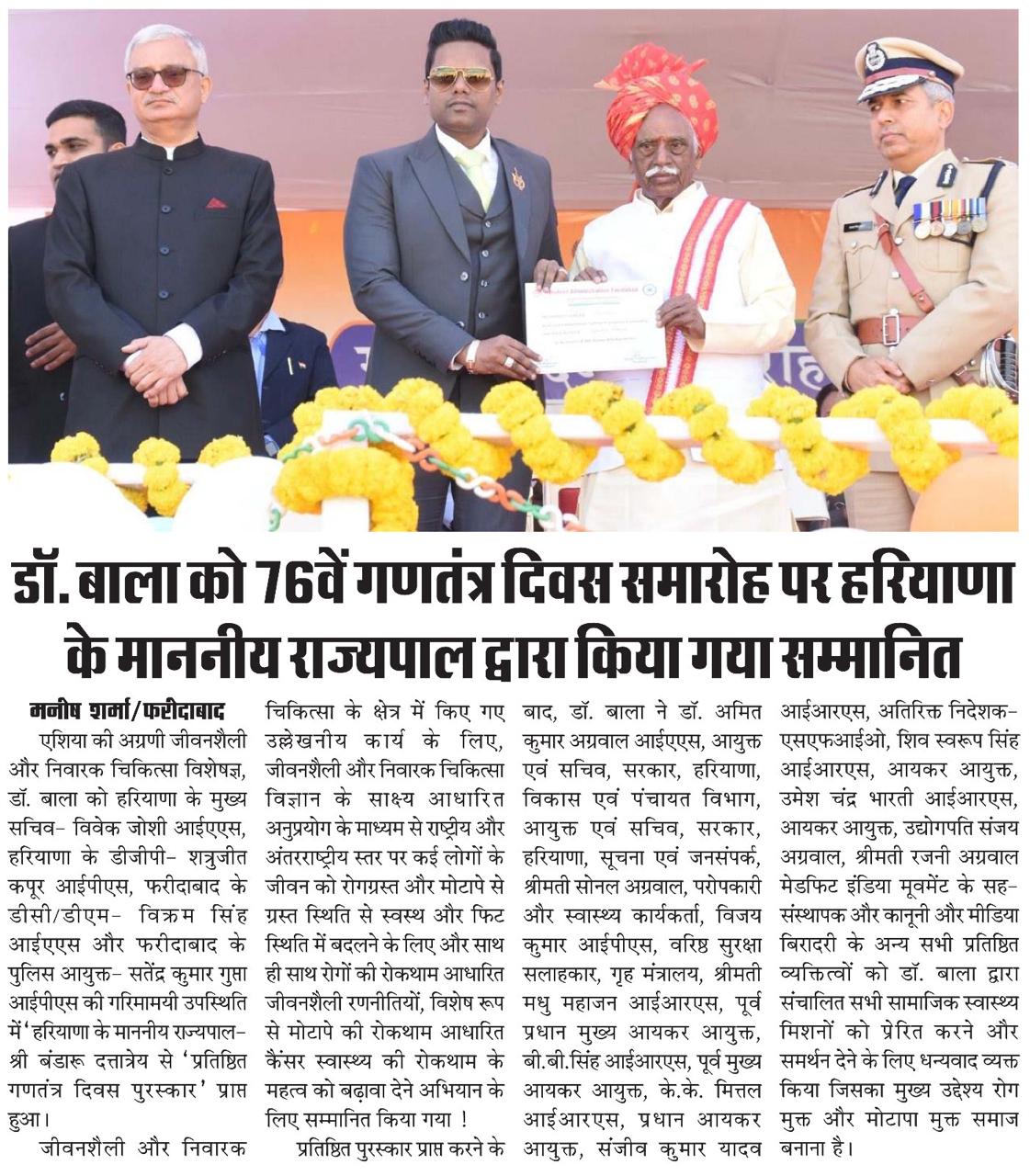 76வது குடியரசு தின விழாவில் ஹரியானாவின் மேதகு ஆளுநரால் திரு டாக்டர் ஜே. சி. பாலசந்தர் அவர்களுக்கு மாநில சுகாதார விருது வழங்கப்பட்டது”….